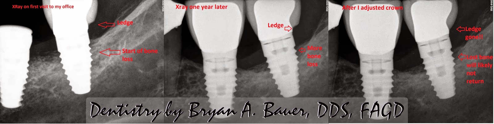 Liz had trouble, more specifically pain, around this implant ever since the crown was put on. After the original dentist (the one that placed the crown on the implant) couldn’t help her, the surgeon that placed the implant referred her to me because he knows I have helped a lot of his other patients in the past with dental problems. Whenever there is pain on an implant and progressive bone loss the first thing I think of is cement sepsis (tips on how to avoid). In between the first x-ray and the second, the surgeon that placed the implant had done an additional surgical procedure to attempt to clean the area of any debris. Due to the implants location and the shape of the crown, completely cleaning out all the cement left behind was impossible without removing the crown. In addition to being able to truly clean it, I knew removing it would allow me to reshape the crown without having the expense of remaking it.